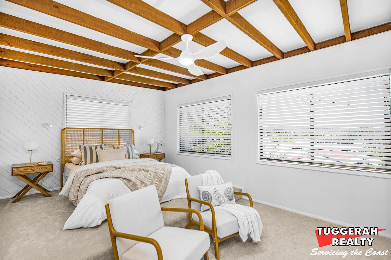 The bathroom has been beautifully updated and features a luxurious spa bath, perfect for unwinding after a long day. A second toilet in the laundry adds practicality for busy households. Upstairs, two additional bedrooms are enhanced by brand new carpet, ceiling fans, exposed beams, and built-in robes. The master bedroom boasts a unique elevated sleeping area, creating a subtle separation between rest and relaxation zones.